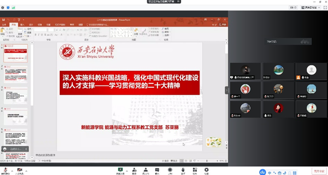 113日和11日下午,能源与动力工程系教工党支部先后组织支部全体教师开展了2次学习二十大精神微党课学习活动,活动以线上线下相结合的方式进行。结合当前二十大精神学习的高潮和支部建设三会一课的要求,党支部书记苏亚丽讲述了题为《深入实施科教兴国战略,强化中国式现代化建设的人才支撑——学习贯彻党的二十大精神》的微党课,对党的二十大报告中关于科技、教育、人才的内容进行了梳理。微党课之后,参会教师表达了对党的二十大精神学习的体会和感悟,大家纷纷表示报告中关于新能源和能源安全的论述给扑克王APP 提供了新的机遇,也提出了新的任务,我们要结合我们的本职工作和我们的专业特色,在新的机遇和挑战之下更上一层楼。能源与动力工程系主任唐凌虹结合自己的访学经历谈到了目前国际形势的复杂多样性,教师党员首先要带头完成好本职工作,结合能动专业要申请工程教育认证的契机,细化教学过程的每一个环节,为高质量人才培养贡献力量。
