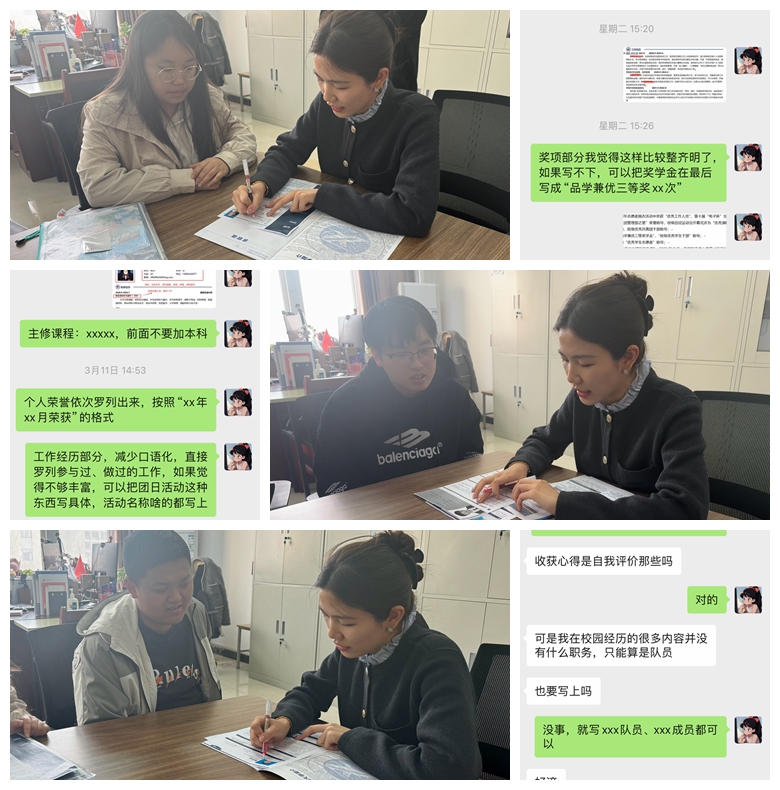 简历作为求职过程中体现自身就业本领重要的一环,毕业班辅导员定期为毕业生修改简历、提升简历质量,并结合自身经验,对简历中模板、格式、语言表达等方面存在的问题一一指出,为在日益紧迫的求职热潮中助毕业生一臂之力。