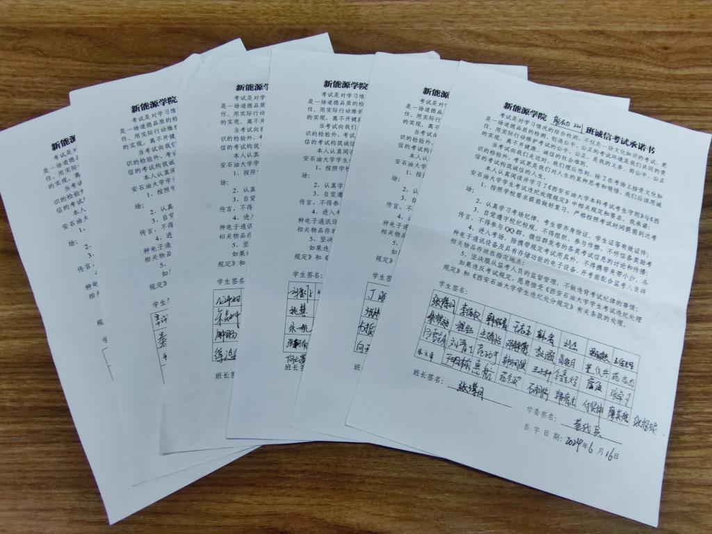 考之以诚,答之以信。学院高度重视学生的道德品质和学术诚信,通过考试诚信教育大会的形式,向学生传达了考试诚信的重要性。会上,各年级辅导员带领大家学习了《西安石油大学学生考试违纪处理规定》中有关考场纪律、违纪处分等相关规章制度。同时,辅导员还强调考试是检验同学们学习成果的最好方式,也是展现我院优良学风的重要窗口,每个人都应该成为诚信考试的倡导者和实践者,以实际行动维护考试的公平性和公正性。另外,辅导员还分享了一些关于诚信考试的案例,旨在警示学生们不要触碰违纪的底线。最后,辅导员预祝同学们在期末考试中取得优异成绩,并希望他们在今后的学习和生活中,能够继续发扬诚信精神,成为社会的栋梁之才。会后,全体同学签署了《诚信考试承诺书》。