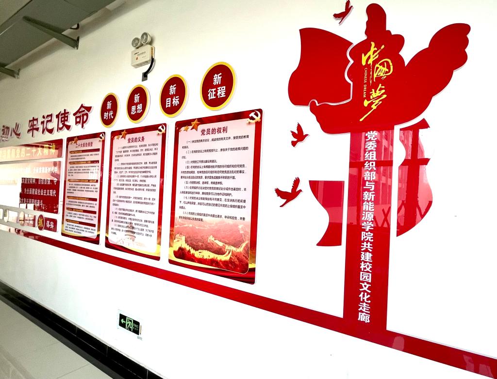 学院充分利用校园文化走廊和学生工作办公室,与校党委组织部共建了党建文化长廊,建成了涵盖党的二十大精神、“数”读党的二十大报告、党的二十大报告摘登、党的宗旨、党的纪律、党员的义务、党员的权利等为主题的文化墙,切实将“空白墙”变为“学习墙”。走廊紧跟新时代步伐,以展板与标语为载体,生动新颖、图文并茂地展示党的二十大报告内容,方便师生在工作和学习之余随时置身其中,潜移默化地接受党的二十大精神洗礼,不断推动党的二十大精神入脑入心。文化走廊充分利用有限的区域发挥宣传作用,不断以科学的理论武装师生,以正确的舆论引导师生,以高尚的精神塑造师生,同时又与“绿能先锋读书角”交相呼应,为推动党建与学风建设深度融合提供了新的平台。