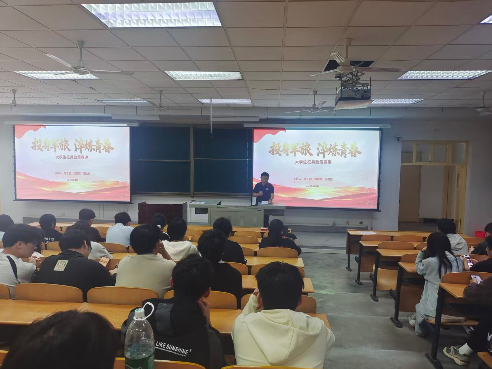 范俊鹏老师以投身军旅、淬炼青春为主题,围绕学校征兵工作现状、大学生入伍优待政策、入伍类型情况、报名注意事项四个方面展开征兵政策宣讲。范老师首先讲解了大学生入伍的学费补偿、助学贷款代偿、退役复学考研加分、专项招生计划、就业优先录用、部队津贴补助等多项利好政策。其次,范老师详细区分了义务兵入伍、士官选拔、应届毕业生入伍等多种入伍形式的服役年限、发展路径与成长优势,结合我校学生真实参军案例,为不同需求的学生提供了针对性的入伍参考。最后,范老师系统讲解了报名时间、线上报名流程、体检标准、政治考核要求、材料准备、审核流程等核心内容,精准解答了大家提出的各类征兵疑问,让同学们全面掌握报名流程与相关要求。