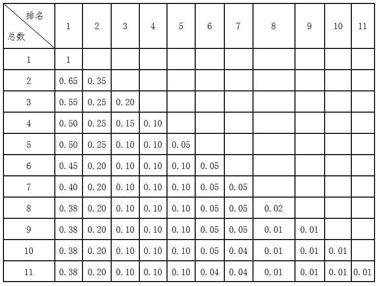 ①某项成果分值10分,共2人参加,申请人排名为第二,则申请人该项目的贡献分为:10×0.35=3.5分。