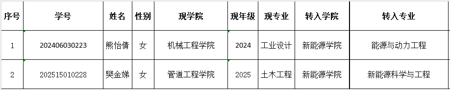 根据《西安石油大学全日制本科生转专业转学管理办法》《西安石油大学关于做好2025-2026学年第一学期本科生转专业工作的通知》及《扑克王APP 本科生转专业实施方案》等相关通知及要求,经本人申请,笔试、面试考核,扑克王APP 本科生转专业工作领导小组审议通过,现将新能源学院拟录取名单公示如下(第二志愿):