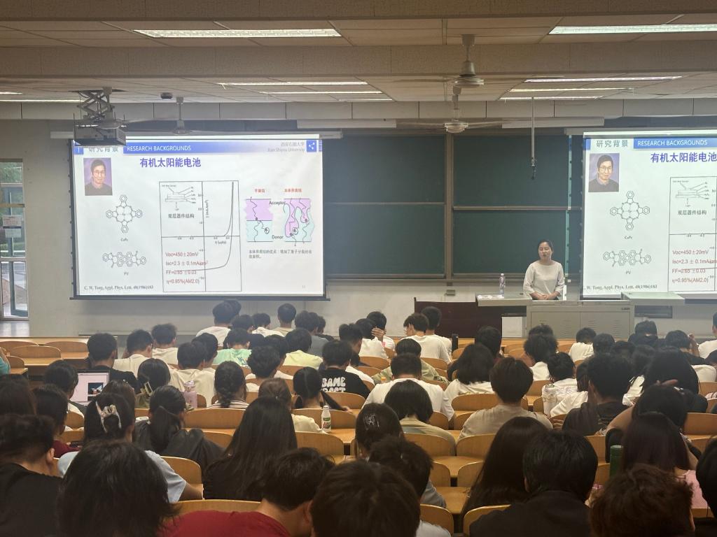 5月15日晚,学院新程大讲堂第8讲“光伏发电技术-有机太阳能电池”在鄠邑校区A139室开讲。本次讲座特邀学院新能源材料与器件系高欢欢担任主讲,学院2023级全体学生参加。讲座中,高欢欢首先介绍了自己的学习和工作经历,接着向大一的同学们科普了当前全球能源的严峻形势,强调新型绿色能源的开发和利用的必要性和紧迫性,详细解读了“双碳”战略提出的背景和重大意义,并由此引入讲座的主题“体相异质结有机太阳电池”。通过对从“器件效率”-“大面积柔性模”-“低成本光伏器件”-“绿色溶剂”-“稳定性/寿命”不同发展阶段,以及工作原理的详细讲解,让同学们对自己所在的学科背景和知识有了更深层次的认识。最后,高欢欢向同学们介绍了体相异质结有机太阳能电池的发展趋势,以及光伏器件和活性层的制备过程和方法,并结合学院的课程设置,带领同学们进一步了解所学专业的培养方案和培养目标,鼓励同学们不断提高自身专业能力,在专业领域持续深耕,积极投身到我国的新能源行业建设当中去。